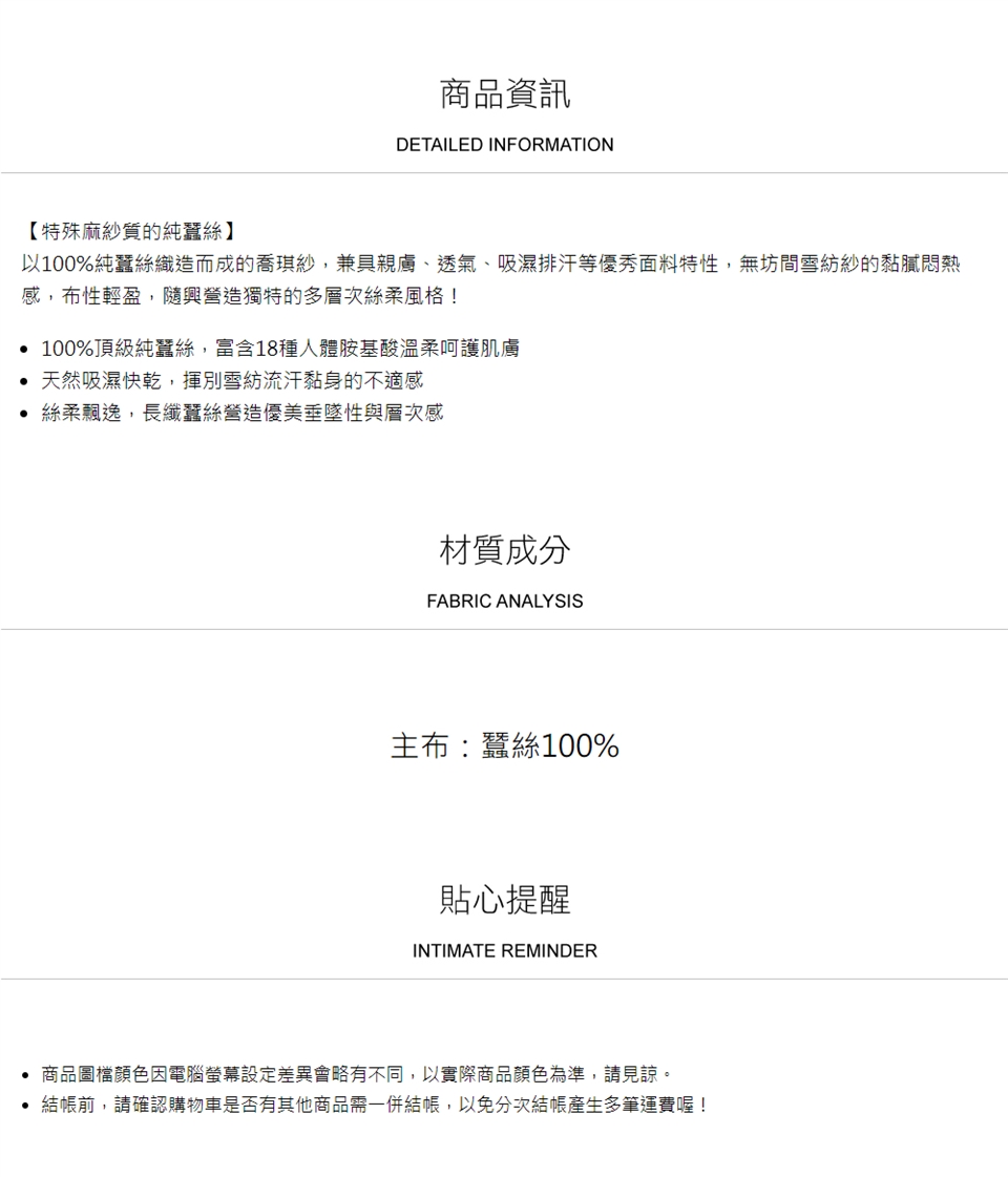 ► 請避免於太陽直射處曝曬,避免蠶絲纖維損壞。