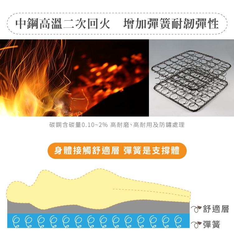 彈簧使用中鋼認證2.3mm硬式彈簧,彈簧碳鋼含碳量0.10~2%,高耐磨、高耐用及防鏽處理;中鋼高溫二次回火,增加彈簧韌度彈性。