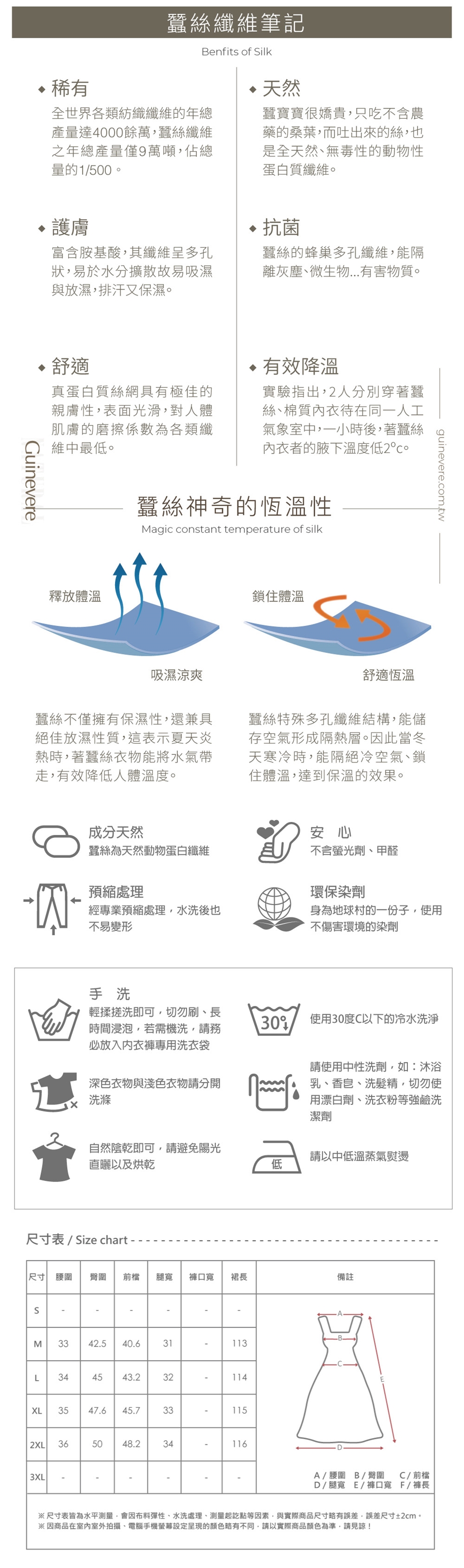 ※洗滌方式: 可水洗,請用40度以下冷水清洗,深淺顏色衣物請分開洗滌。請使用中性洗劑 (如:蠶絲專用洗潔液、沐浴乳、洗髮精),切勿使用漂白水、洗衣粉、冷洗精等強鹼洗劑。請於陰涼處晾乾即可,避免陽光曝曬。