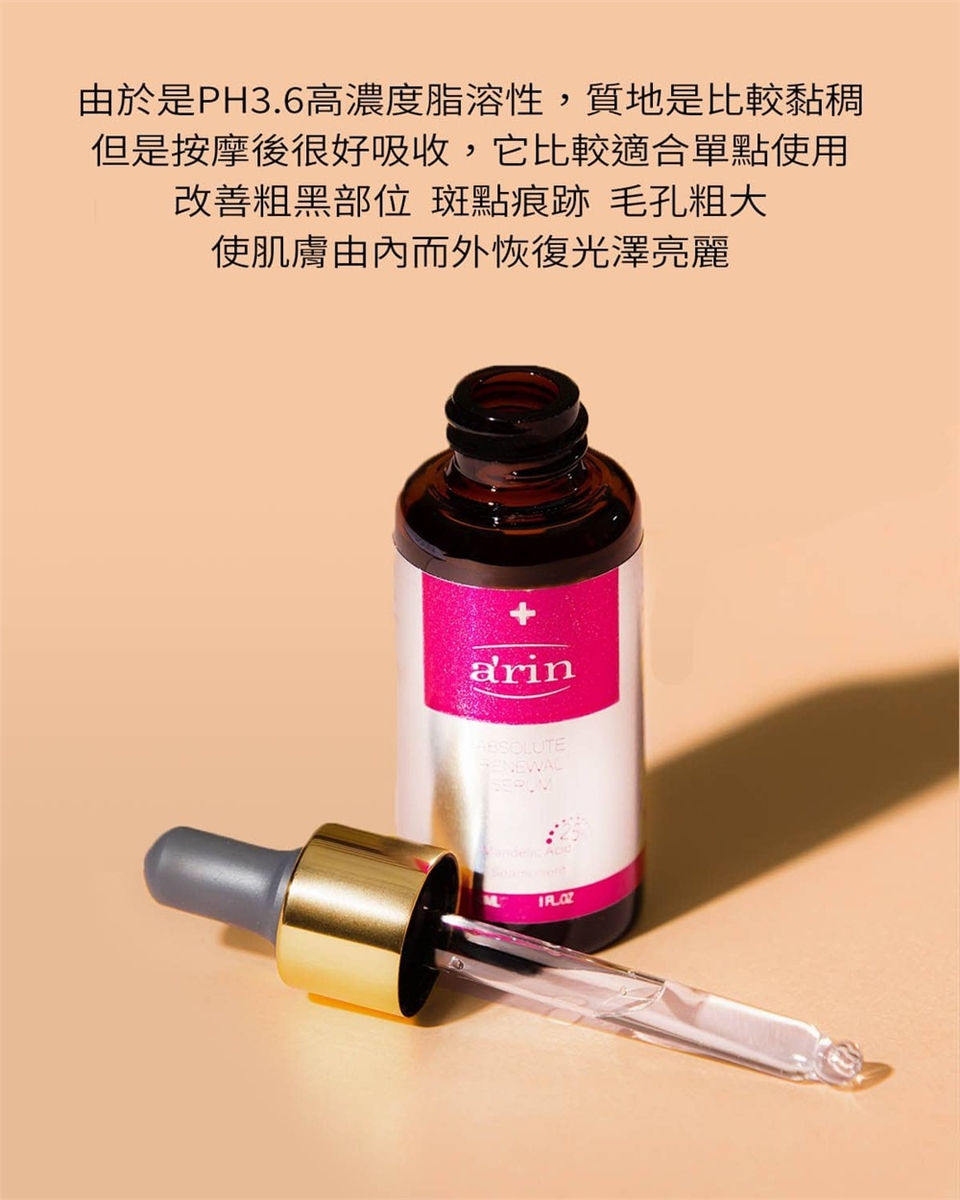 ‧卸妝清潔後→杏仁酸亮白煥膚精華→日常保養;薄薄塗抹於全臉或毛孔粗大地方(避開眼和唇周肌膚),讓杏仁酸均勻滲透至肌膚。