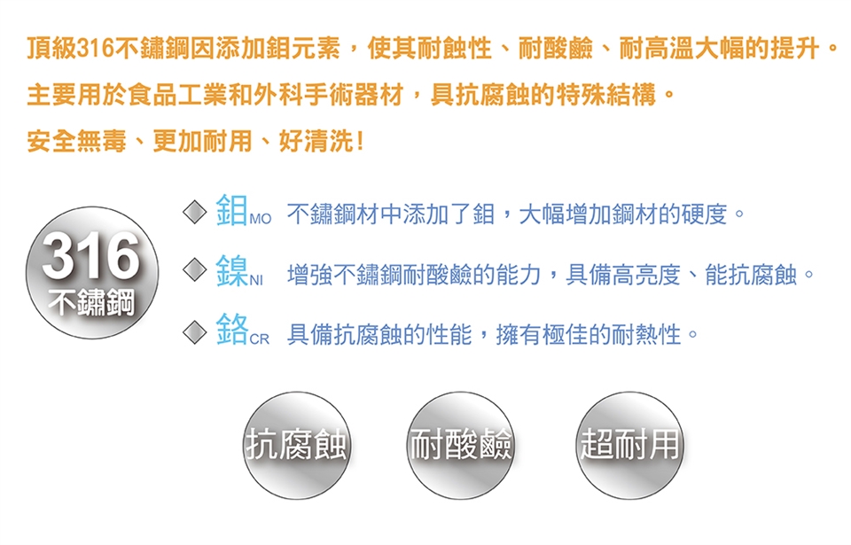 材質:316不鏽鋼多層複合金強化處理、耐熱電木