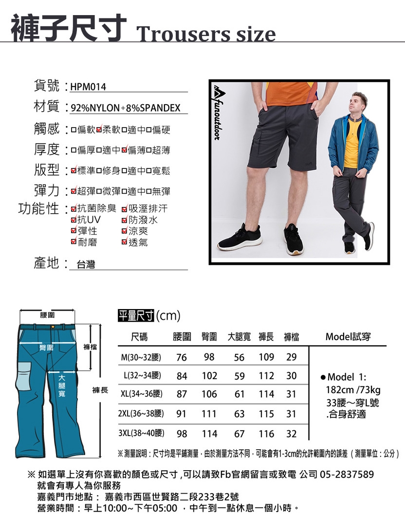 ** 試穿建議 : 182cm/73kgs, 實量腰圍 33腰, 褲子穿著 L 腰, 寬鬆舒適.