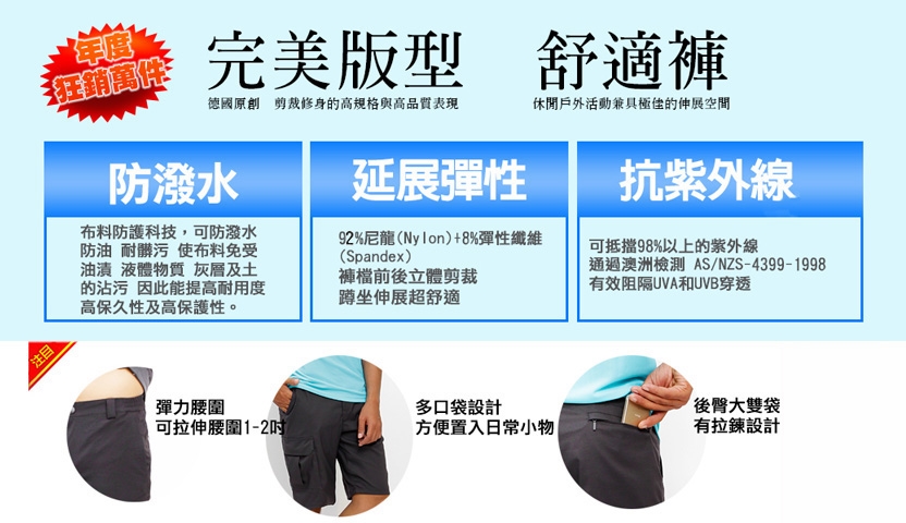 材質:表布 92%尼龍NYLON + 8%Spandex彈性纖維 (超潑水處理), 裡布100%NYLON