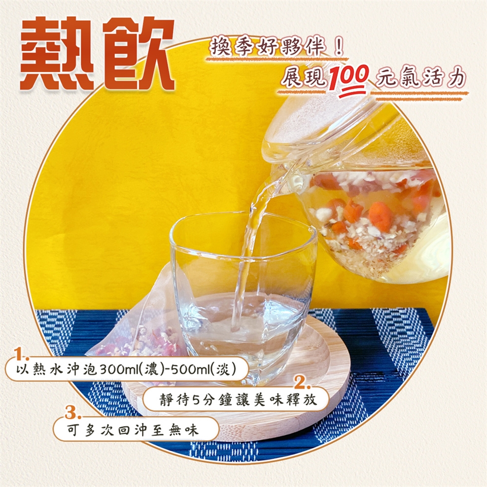 2.加入95°C以上,300ml(濃)-500(淡)ml熱開水沖泡。