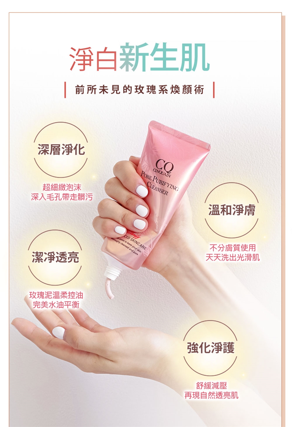 擠出約2cm潔顏乳,加水搓揉出豐潤細緻泡沫清潔臉部,可針對鼻頭、T字部位多加按摩,再以清水洗淨即可。亦可做敷面泥膜,每周敷1-2次,全臉薄敷約60秒,再以清水洗淨。