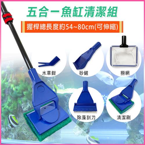 Aqua Tools-五合一魚缸清潔組-伸縮款(清潔刷、撈網、除藻刮刀、砂鏟、水草鉗-長柄魚缸刷)