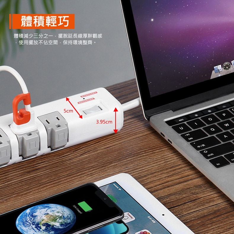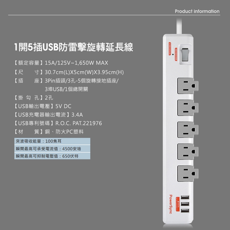 ◆品名:1開5插3埠USB防雷擊抗搖擺旋轉延長線