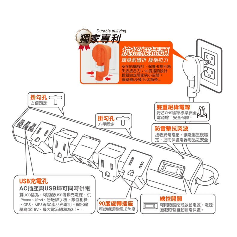 ◆插座:3Pin插頭/3孔-5個旋轉接地插座/3埠USB/1個總開關