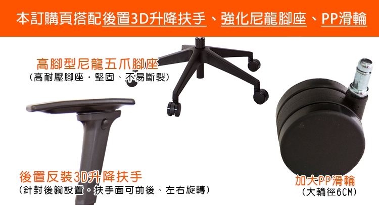 本訂購頁規格:後置3D升降扶手、尼龍高腳座、PP滑輪
