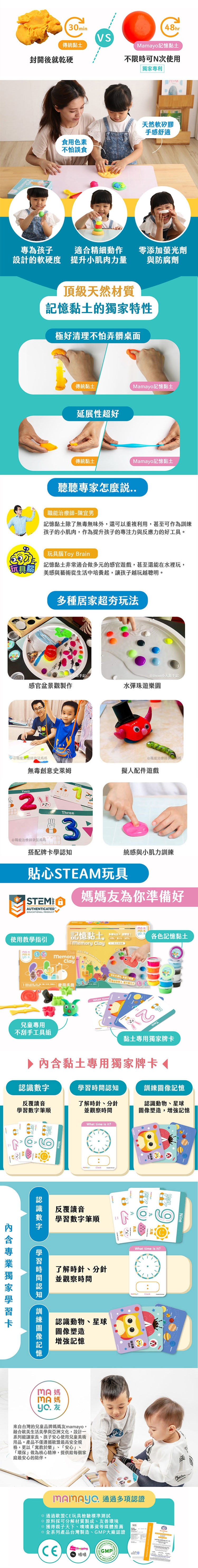 內容物:12色無毒記憶黏土(30g/色)、黏土手冊、黏土工具組、擬人配件組含壓模、益智牌卡