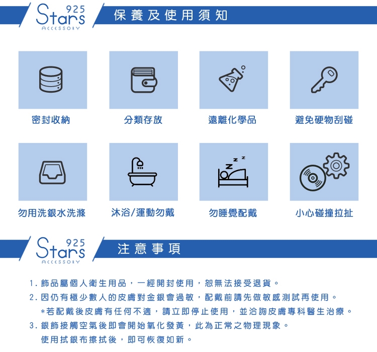 ◆飾品一經使用可能隨時間失去光澤或褪色,此為正常物理現象,妥善使用拭銀布即可恢復光澤。