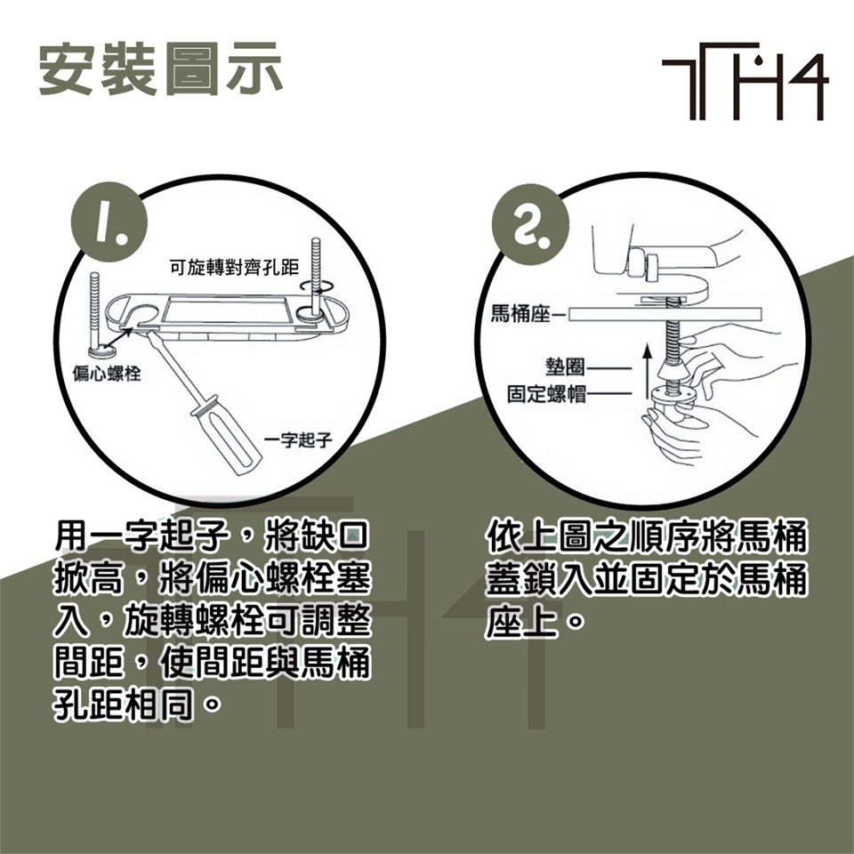 商品說明/固定蓋座專利設計,附有前後凹槽,加上可調整式偏心軸螺絲,可調整長度,適用於一般型的42~44公分和加長型的46~48公分陶瓷馬桶座。適用TOTO、HCG...等進口廠牌下鎖式安裝固定馬桶座。附安裝螺絲組。