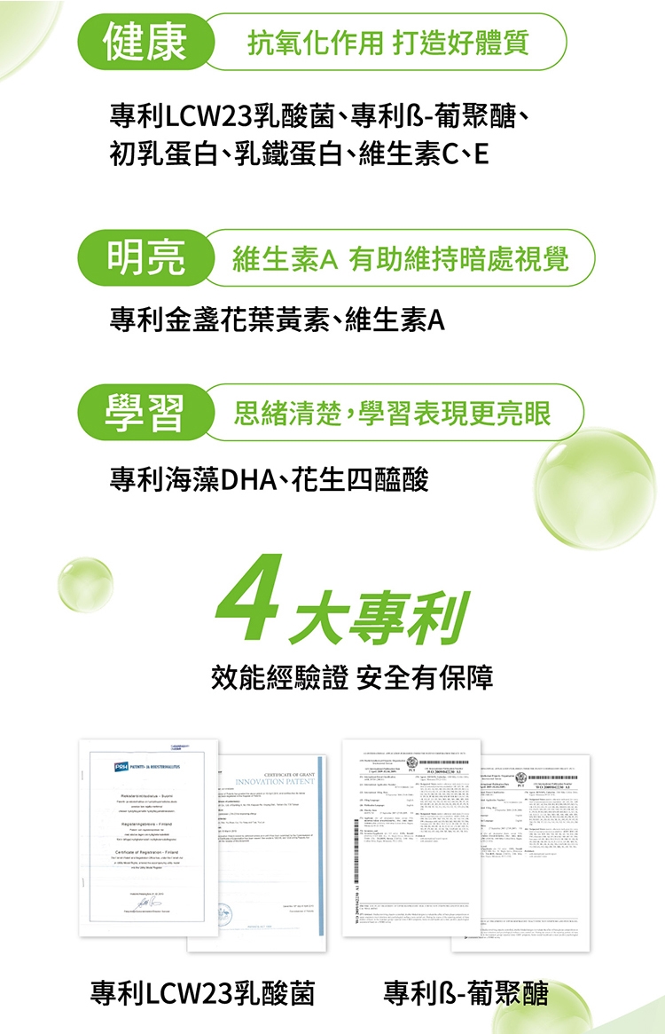 混合維生素E(抗氧化劑)】、維生素A【含麥芽糊精、阿拉伯膠、玉米澱粉、維生素A醋酸酯、維生素E(抗氧化劑)】、本多酸鈣、副乾酪乳酸桿菌(Lactobacillus paracasei LCW23)、