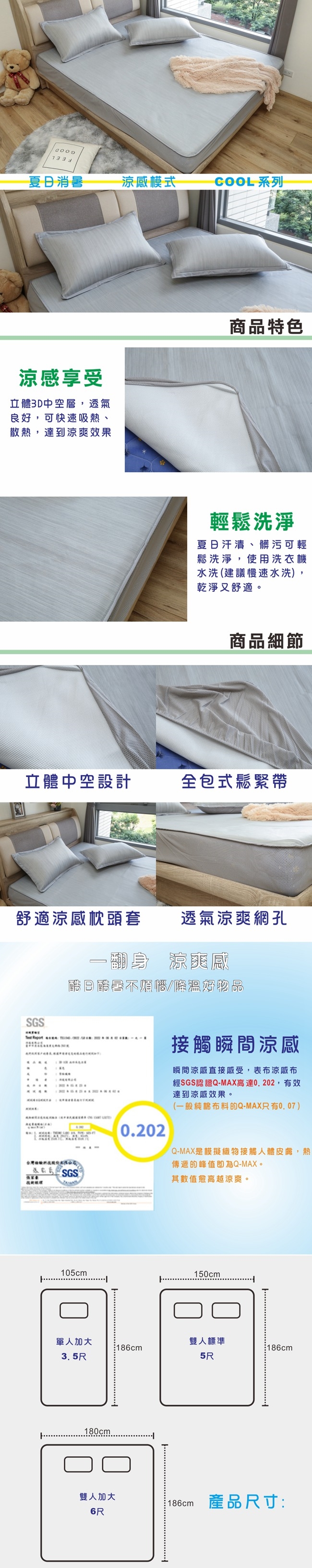 天氣越來越炎熱,冷氣使用量越來越大,有沒有其他方法能讓床鋪更涼爽、更好眠呢?這款最新『3D涼感床包組』絕對是你在炎炎夏日不可或缺的好物。表布材質採用100%涼感紗,經SGS認證Q-MAX值達0.202,比一般純棉布料的0.07高了將近3倍,觸感涼爽,能達到涼感的效果。底層更搭配3D透氣墊,洞洞網布讓熱氣更易散出。涼感紗+3D透氣墊兩者結合,讓床包可快速吸熱、散熱,達到涼感的效果。搭配冷氣或電扇,可調高冷氣溫度,更節能省電。整個床包組可洗衣機水洗,清潔不費力。