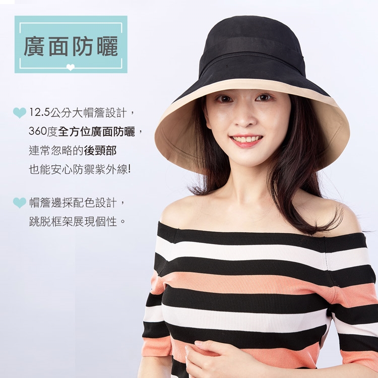 - 12.5公分大帽簷,廣面遮陽。常忽略的後頸部也能安心防曬