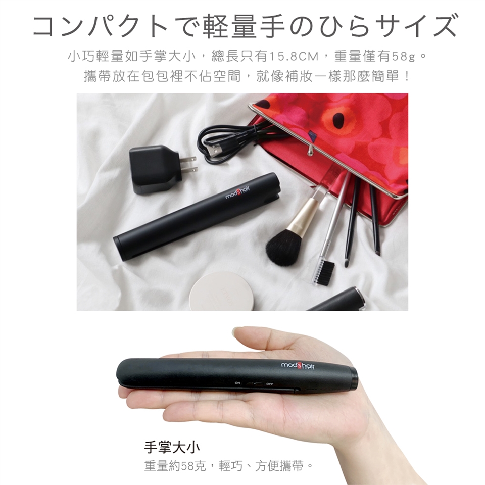 mod's hair USB插電式迷你直髮夾,方便收納在化妝袋、包包中隨身攜帶。