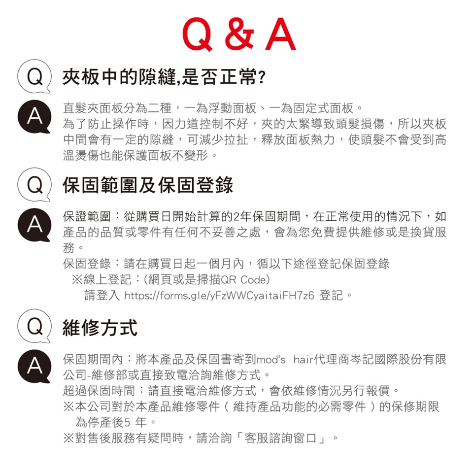 4.產品若已過保固時效,請致電洽詢mod's hair代理商岑記國際股份有限公司或是上Facebook粉絲專頁【mod's hair美髮造型器-Taiwan】,詢問維修詳情。