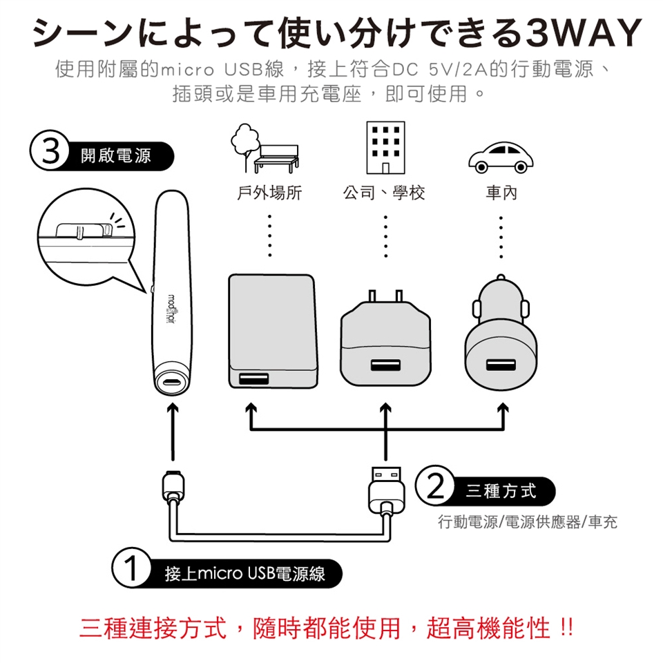 使用隨附的microUSB,電源線連接行動電池(輸出為2A或更大)或USB車用插座(輸出為2A或更大)