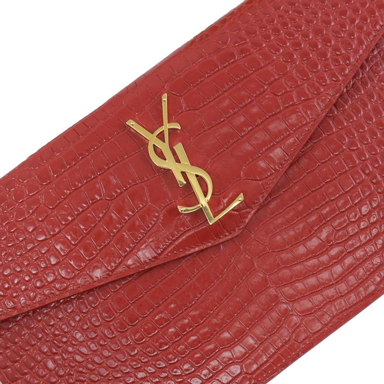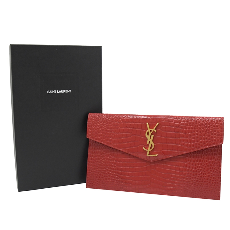 SAINT LAURENT YSL 專櫃熱賣手拿包,採用YSL金屬LOGO與鱷魚紋小牛皮材質,翻蓋磁釦開口,內可放票據、手機、存摺等隨身物品,實用性高,柔軟小牛皮觸感,高雅耐看的必備單品,美觀又實用
