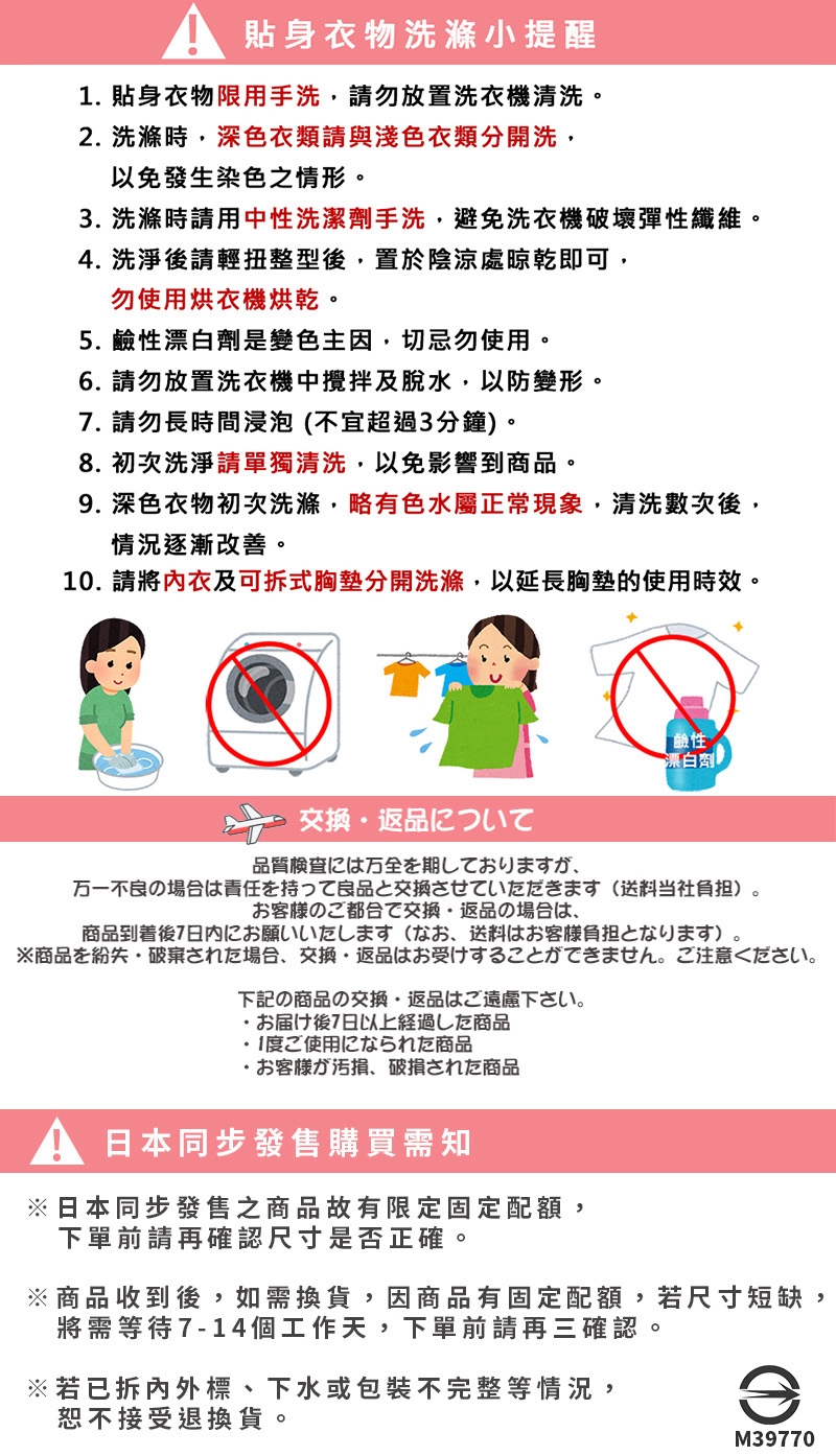 2. 洗滌時請用中性洗潔劑手洗,避免洗衣機破壞彈性纖維。