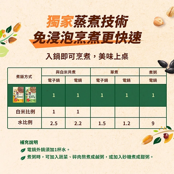 ◆ 獨家蒸煮技術,免浸泡,入鍋即可烹煮,美味快速上桌