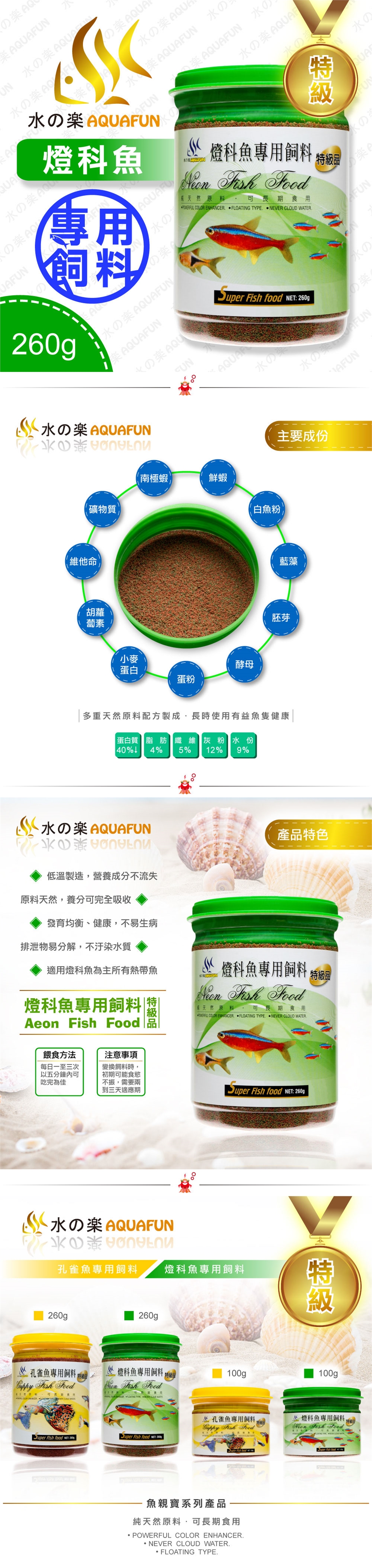 ● 營養成分:南極蝦、鮮蝦、白魚粉、藍藻、胚芽、酵母、蛋粉、小麥蛋白、胡蘿蔔素、維他命、礦物質,蛋白質40%↓、脂肪4%、纖維5%、灰粉12%、水份9%