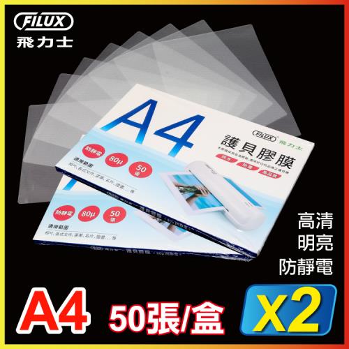 【優選特惠組】FILUX 飛力士 高清明亮防靜電A4護貝膠膜 (50張/盒X2,共100張)
