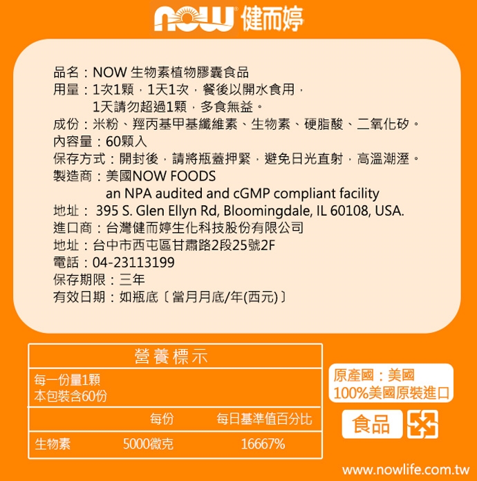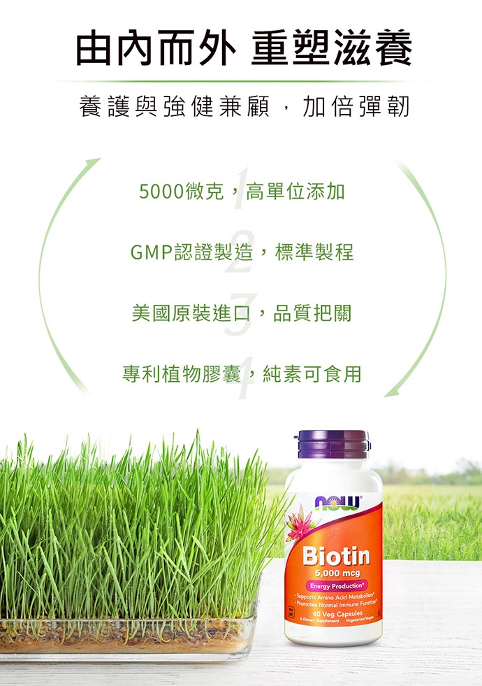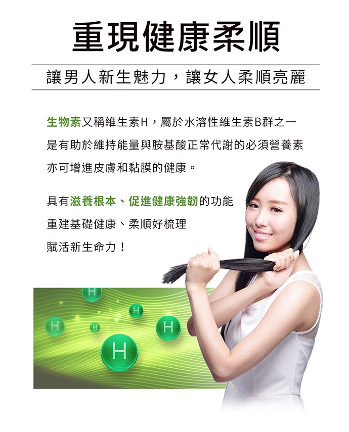 又稱維生素H,屬水溶性維生素B群的一種。生物素是新陳代謝不可或缺的物質,也是維持正常成長、發育及健康必要的營養素,無法經由人工合成。 生物素是構成輔脢的一種成分,參與能量及胺基酸的代謝,可增進皮膚與黏膜的健康,亦可幫助維他命B群的利用。