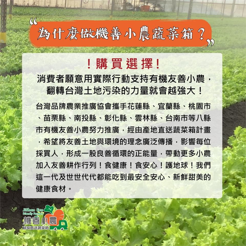 👉了解到許多顧客都會有不愛吃的蔬菜,小農提供換菜服務,請於下單時備註不想收到的蔬菜(請勿超過3樣),我們將於出貨時改以其他同價位蔬菜替代,除非遇產量不足無法替換,敬請見諒。