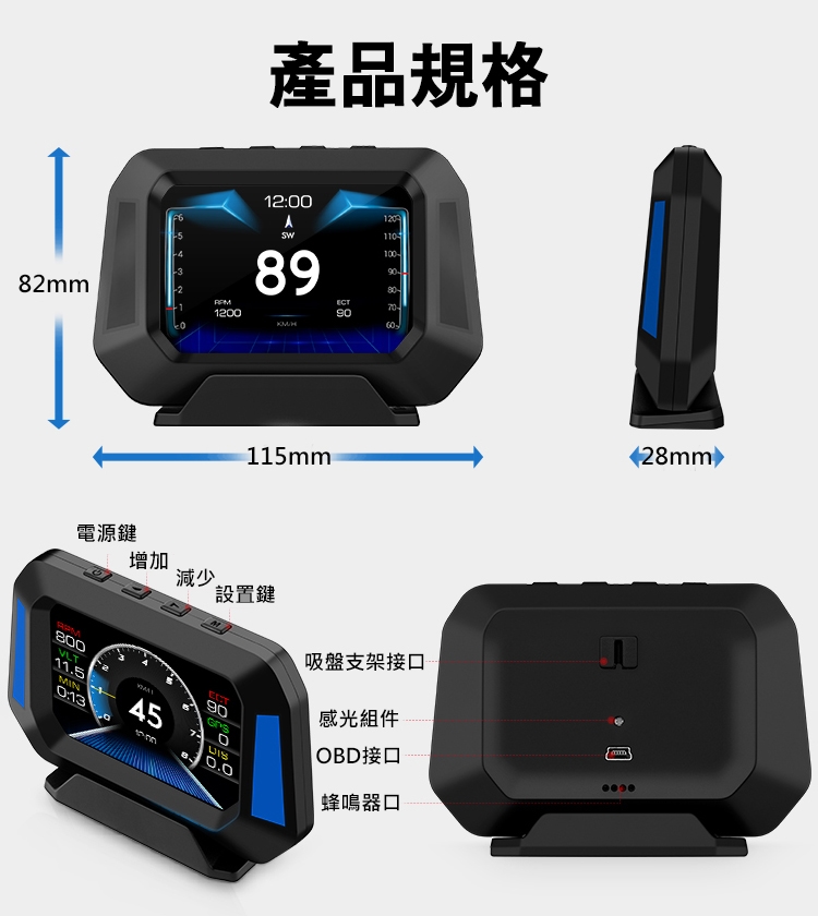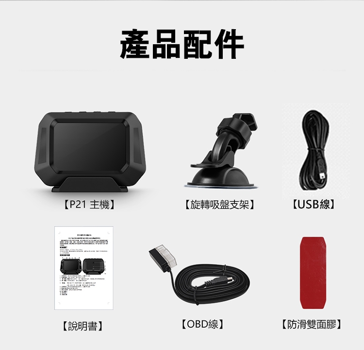 .產品內容:P21主機x1、OBD線x1、USB線x1、旋轉吸盤支架x1、防滑雙面膠x1、說明書x1
