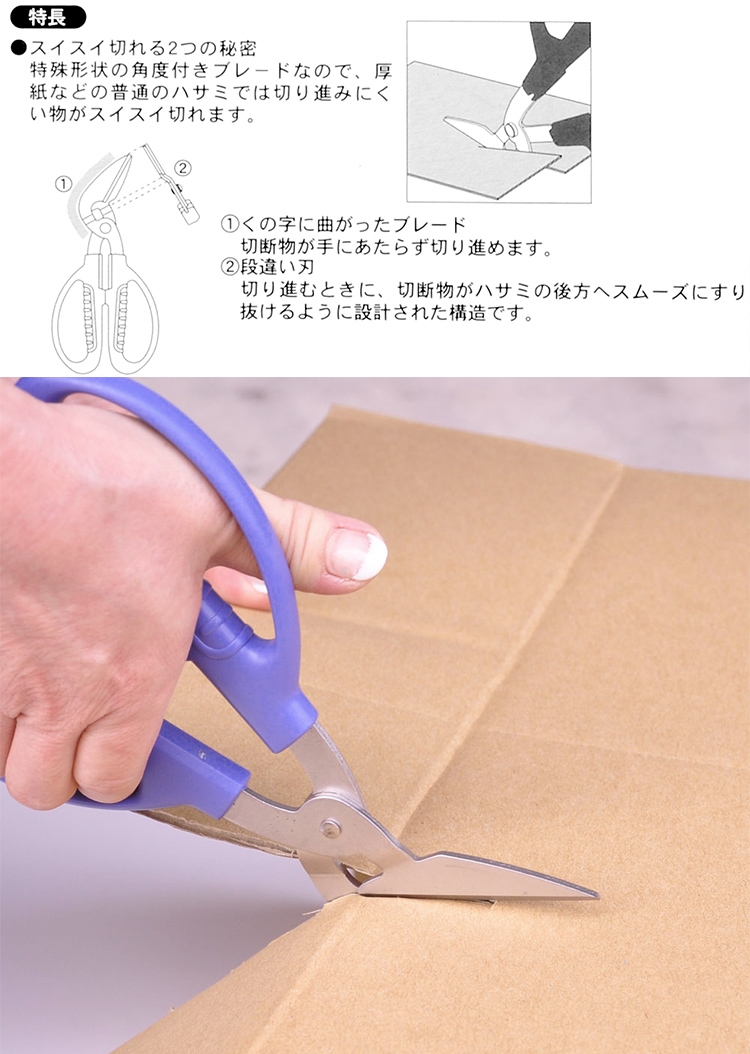 ●特殊角度ㄑ型斜刃設計,可以輕鬆切剪紙箱不會卡住。
