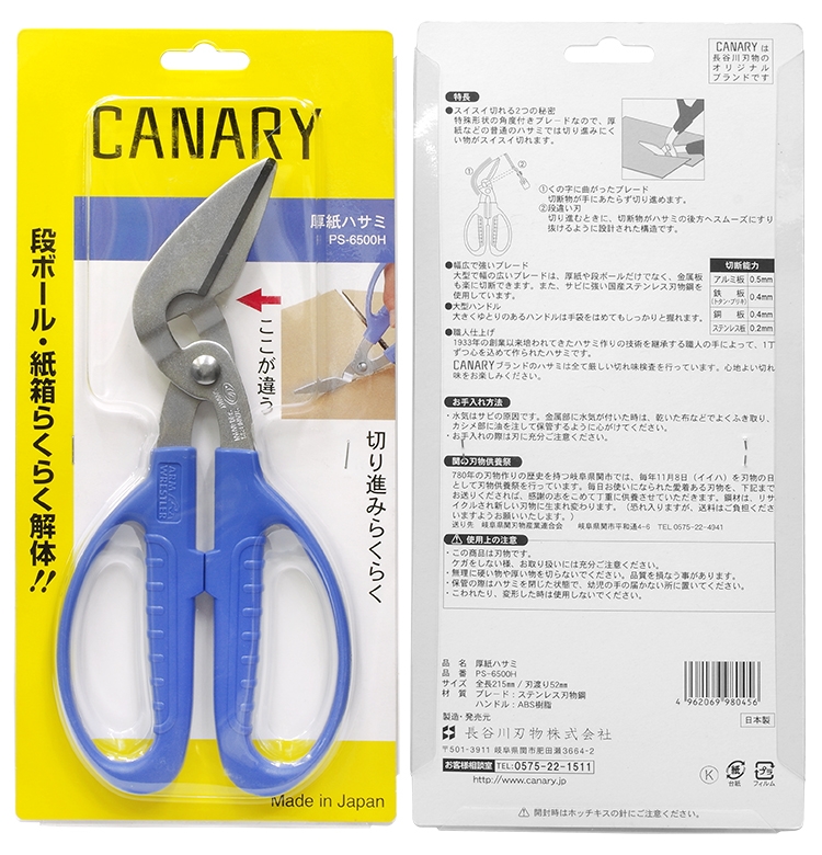 ●【品名】日本長谷川刃物CANARY剪紙箱金屬板用不鏽鋼剪刀PS-6500H(ㄑ型斜刃長52mm;大握把適大手掌)適厚紙鋁板白鐵板銅板不鏽鋼板