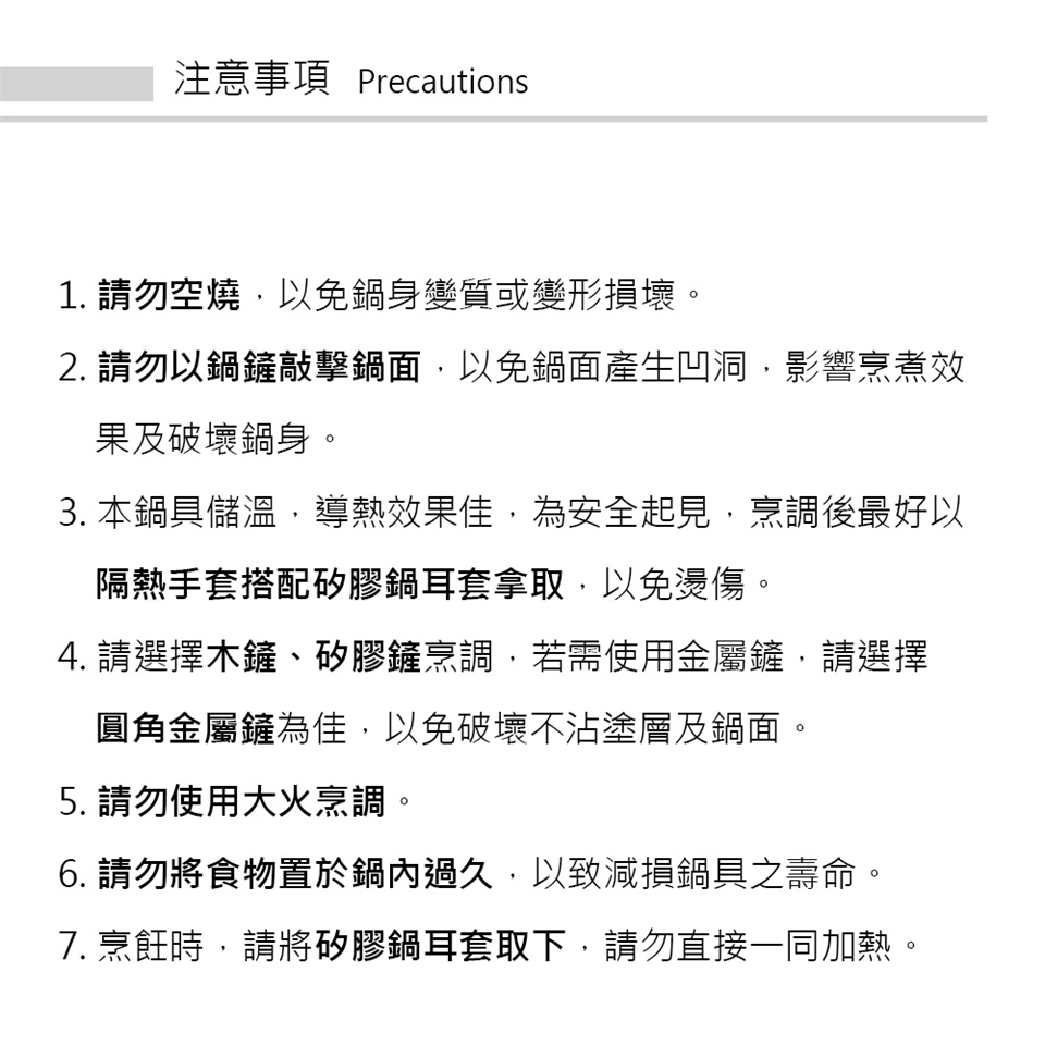 8.鍋子導熱性佳,拿取鍋子時務必使用隔熱物品,避免高溫燙手。