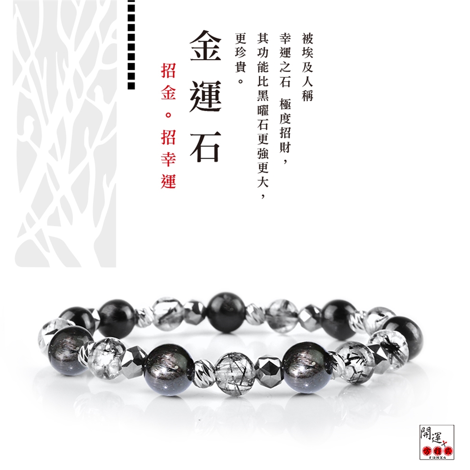 黑銀線是極品,可增強生命力,恢復人的精神、體力,對用腦過度的上班族和創意工作者有很好的平衡作用。可強健腎臟,吸收病氣,增進睡眠;對酗酒,抽煙,藥品成癮有改善作用;可使人穩重,舒緩壓力,心平氣和,消除情緒困擾,並可加強行動力,增強領袖魅力、向心力,埃及制定,不容許佩戴金運石參與賭場,賭馬,股票場所 說明金運的能力已經被人們所鑒定