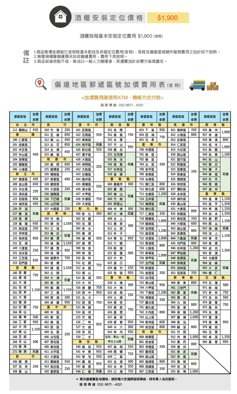 運送跨區區域 運費另外支付 詳見跨區收費表