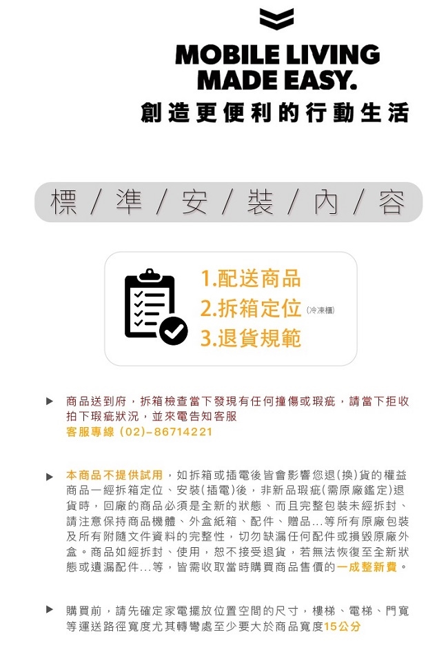 ※家電商品辦理退換貨,若非新品瑕疵,商品一經安裝、插電運轉即無法回復完整新品,將會有整新費及運費等相關費用,敬請注意