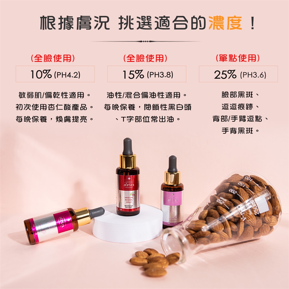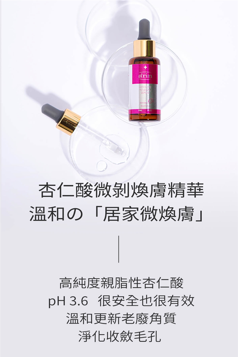 ‧卸妝清潔後→杏仁酸亮白煥膚精華→日常保養;薄薄塗抹於全臉或毛孔粗大地方(避開眼和唇周肌膚),讓杏仁酸均勻滲透至肌膚。