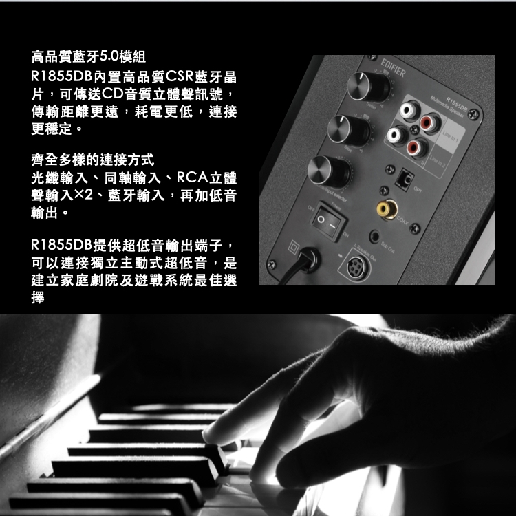 多元輸入介面整合|支援藍牙、光纖、同軸與 RCA 類比輸入,可同時對應電視、電腦、遊戲主機與行動裝置。