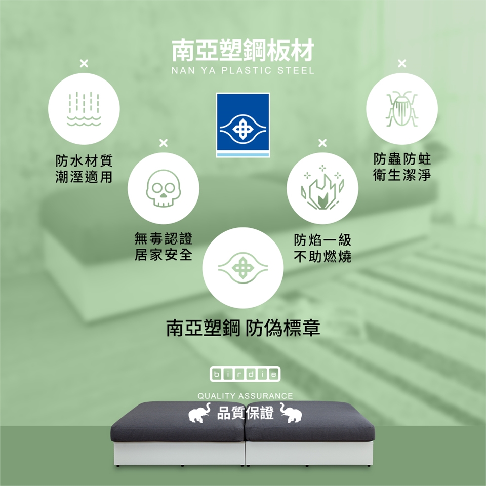 100%徹底防水板材,不怕浸水、適用長期潮濕的環境,可整組水洗清潔更容易,不因潮濕而變形、腐蝕、掀皮;具防蟲蛀抗黴菌特性,防白蟻、蟑螂侵蝕,長久使用也不用擔心塌陷變形!