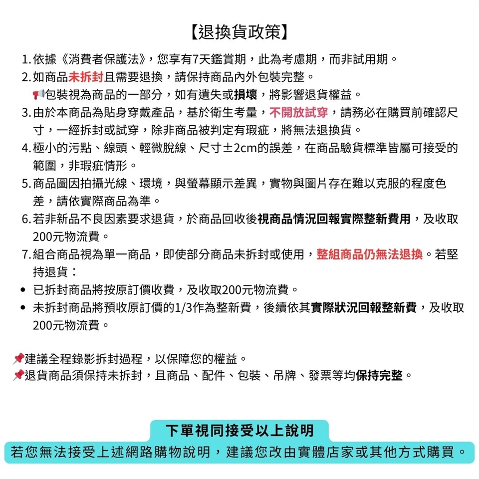 ☄為維護雙方權益,建議您全程錄影拆封過程,欲退貨之商品須為未拆封狀態:商品、配件、包裝、吊牌、發票等皆須完整。