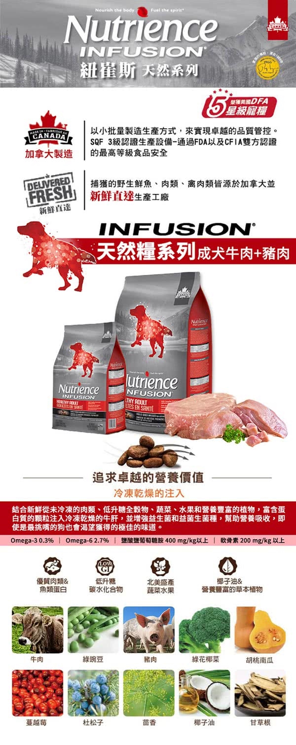 去骨牛肉, 去骨豬肉, 刀切燕麥, 洋薏米, 青豌豆, 紅扁豆, 豬油, 羊肉粉, 天然豬肉風味, 曬乾苜蓿粉, 牛肝凍乾, 鮭魚油, 椰子油, 碳酸鈣,南瓜, 胡桃南瓜, 胡蘿蔔, 菠菜, 花椰菜, 蘋果, 藍莓, 小紅莓, 紅石榴,杜松子萃取物, 生薑, 茴香, 洋甘菊, 薄荷葉, 甘草根, 薑黃, 維生素 (維生素E補充, 維生素A補充, 菸鹼酸 (維生素B3), 泛酸鈣(維生素B5), 核黃素(維生素B2), 鹽酸?哆辛(維生素B6), 硫胺(維生素B1), 生物素(維他命B7), 維生素B12補充, 維生素D3補充, 葉酸(維生素B9) ), 礦物質 (硫酸鋅, 蛋白鋅, 蛋白鐵, 硫酸亞鐵, 蛋白銅, 硫酸銅, 蛋白錳, 氧化錳, 碘酸鈣, 亞硒酸鈉), 氯化鉀, 鹽, 卵磷脂, 氯化膽鹼, 菊苣根萃取物, 酵母萃取物, DL-甲硫氨酸, L-離胺酸, 鹽酸鹽葡萄糖胺, 軟骨素, 迷迭香萃取物, 嗜酸乳桿菌, 乾酪乳桿菌, 比菲德氏菌, 腸球菌