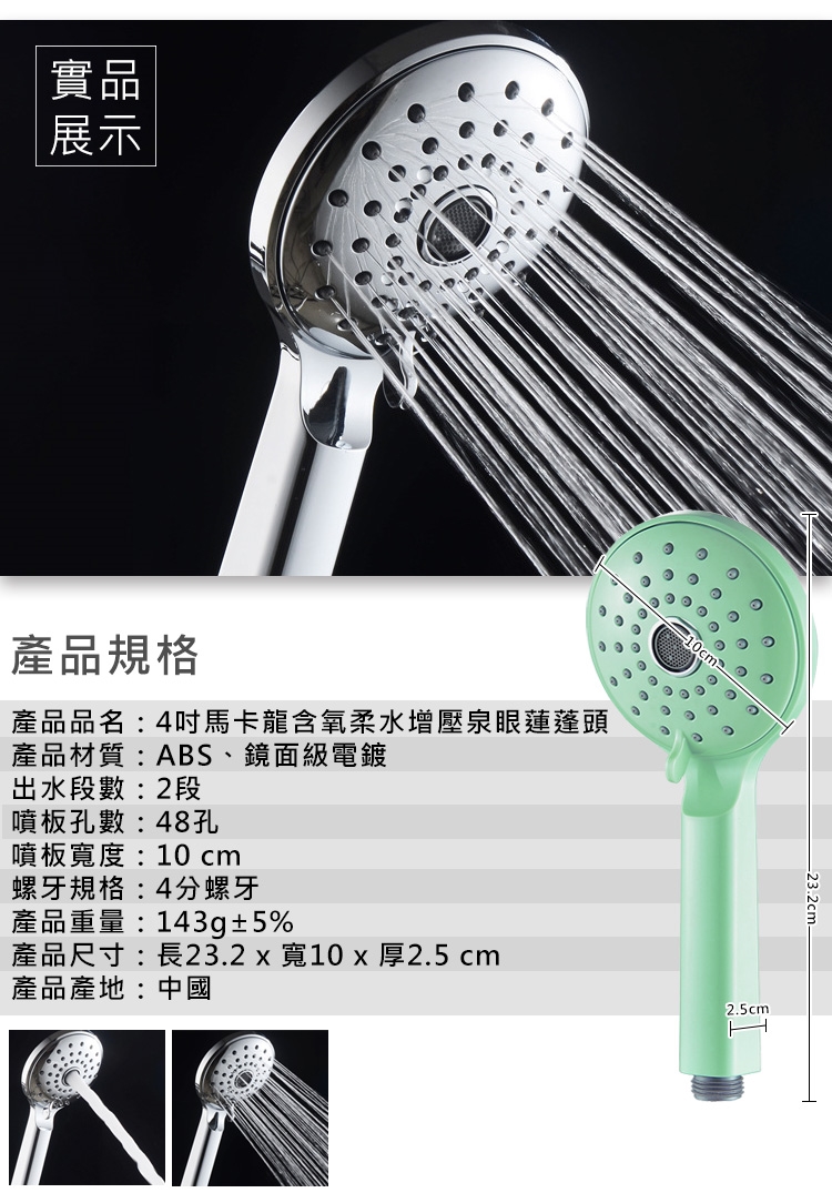 產品品名:4吋馬卡龍含氧柔水增壓泉眼蓮蓬頭