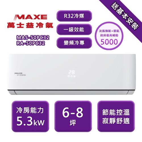 【家電速配 MAXE 萬士益】PC系列 6-8坪 一級變頻冷專分離式冷氣 MAS-50PC32/RA-50PC32