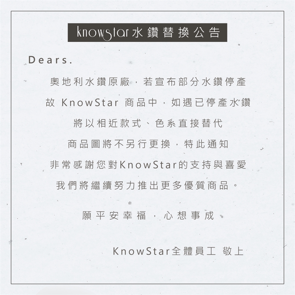 ※凡購買KnowStar商品,會隨貨附一張售後服務卡,購買皆享有免費補鑽服務,若需補鑽,請將商品及售後服務卡寄回KnowStar原廠