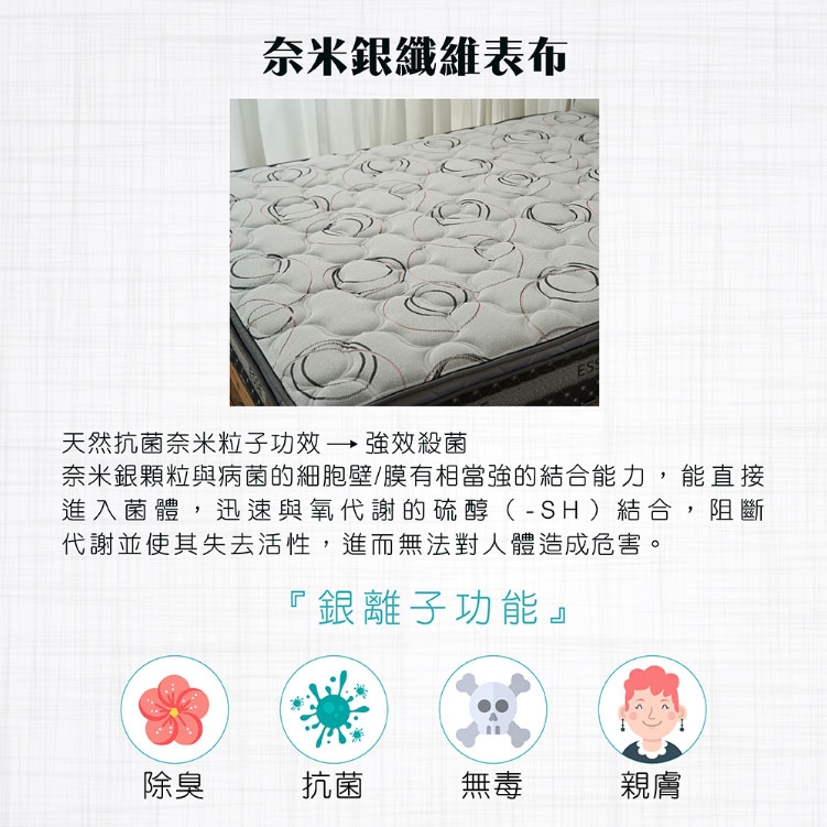 ESSE御璽名床【銀離子抑菌】三線獨立筒床墊,表布採用銀離子功能布,天然抗菌奈米粒子功效,強效殺菌;銀離子具有除臭、抗菌、無毒、親膚等功能。