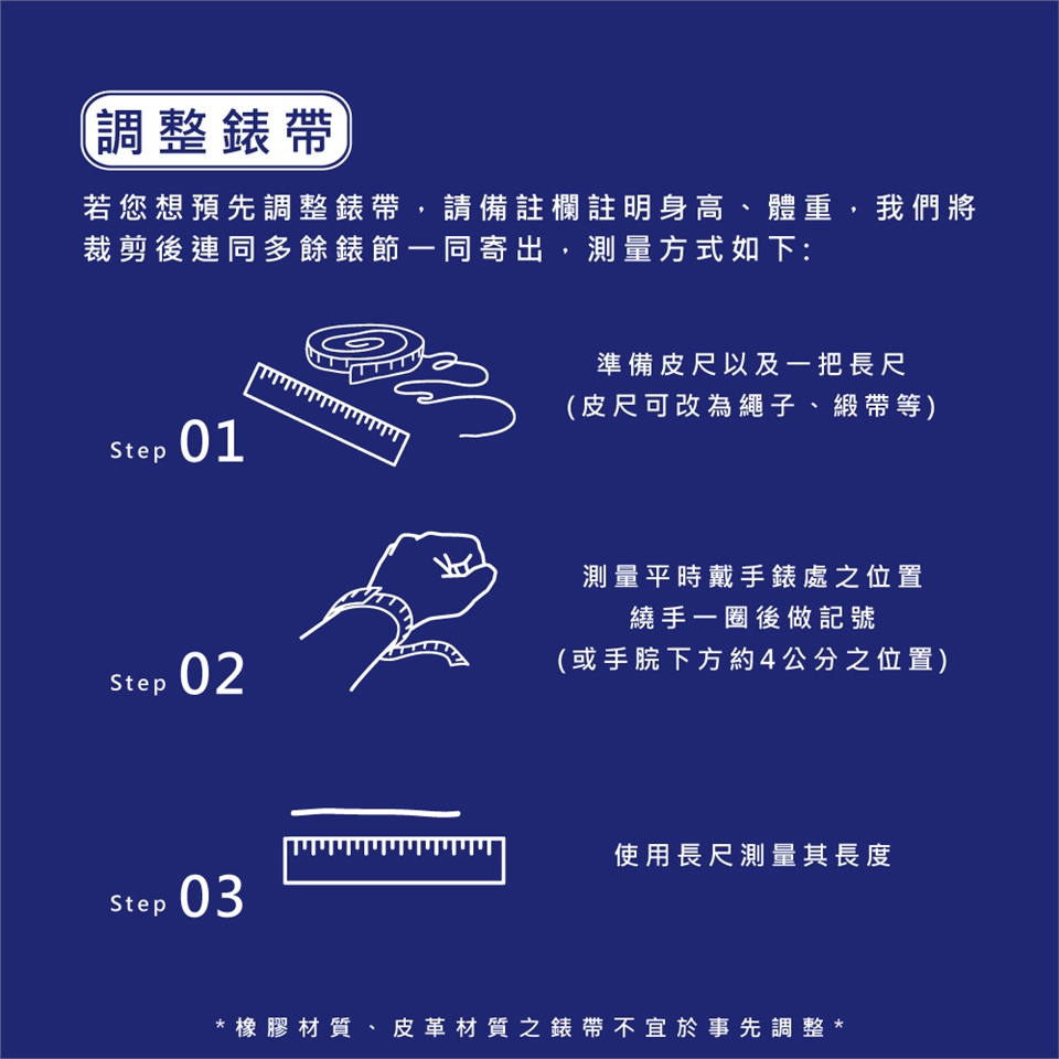 若您想預先調整錶帶,請備註欄註明身高、體重,我們將裁剪後連同多餘錶節一同寄出,測量方式如下-