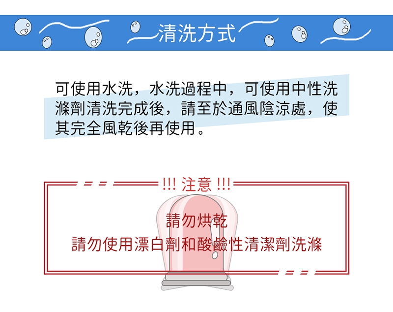 ◎勿使用漂白劑或酸鹼性清潔劑洗滌