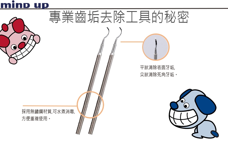 用於牙齦與牙齒連接處,使用時輕輕由上往下刮除牙垢或牙結石(上下齒則反之)。