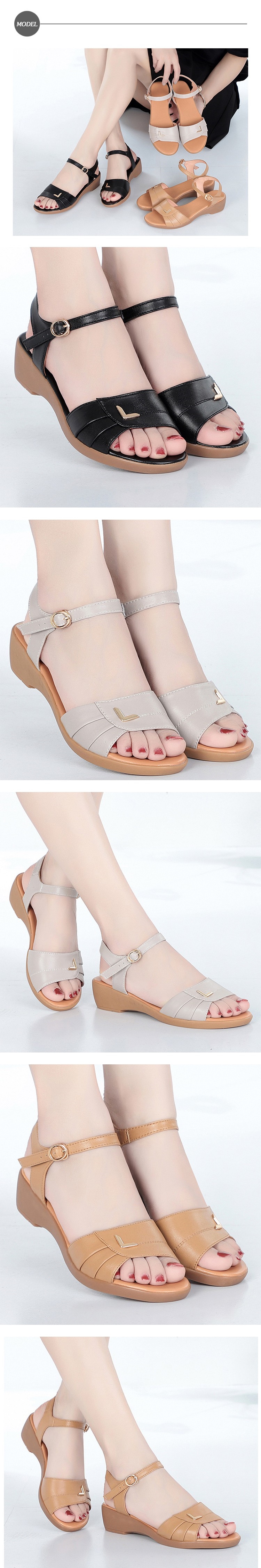 【MOM】涼鞋 坡跟涼鞋/真皮舒適圓頭金屬釦飾優雅坡跟涼鞋 黑