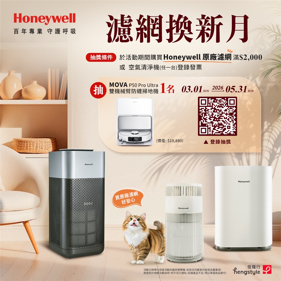 美國Honeywell 抗敏負離子空氣清淨機(小敏)運用前向進風設計及超越H13級的HEPA濾網提升進風效率,使能源運用更有效率,不但更省電,也全面提升淨化效果,自動偵測PM2.5與TVOC,利用四重過濾,包含超越H13級的HEPA濾網、超密緻蜂巢顆粒活性碳濾網、1900萬負離子等多重把關,獲得SGS 檢測99.99%濾淨人冠狀病毒、H1N1、H3N2以及其他病菌。有了小敏空氣清淨機,有效降低空氣中的過敏原與異味,讓消費者每一口呼吸都安心!